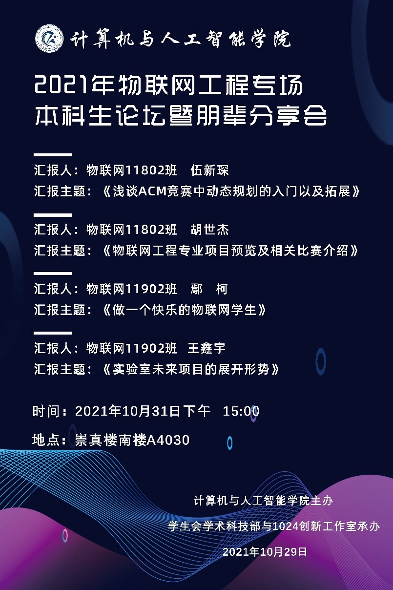 10月31日下午,2021年物联网工程专场本科生学术论坛暨朋辈分享会在崇真南楼A4030如期举行。本次论坛邀请了物联网专业2018级同学伍新琛、胡世杰和2019级同学鄢柯、王鑫宇分享学术和学科竞赛经验,公司党委副书记涂耀威、副经理魏雄及物联网工程系主任聂刚出席了本次论坛。