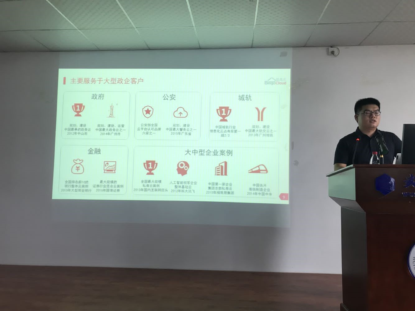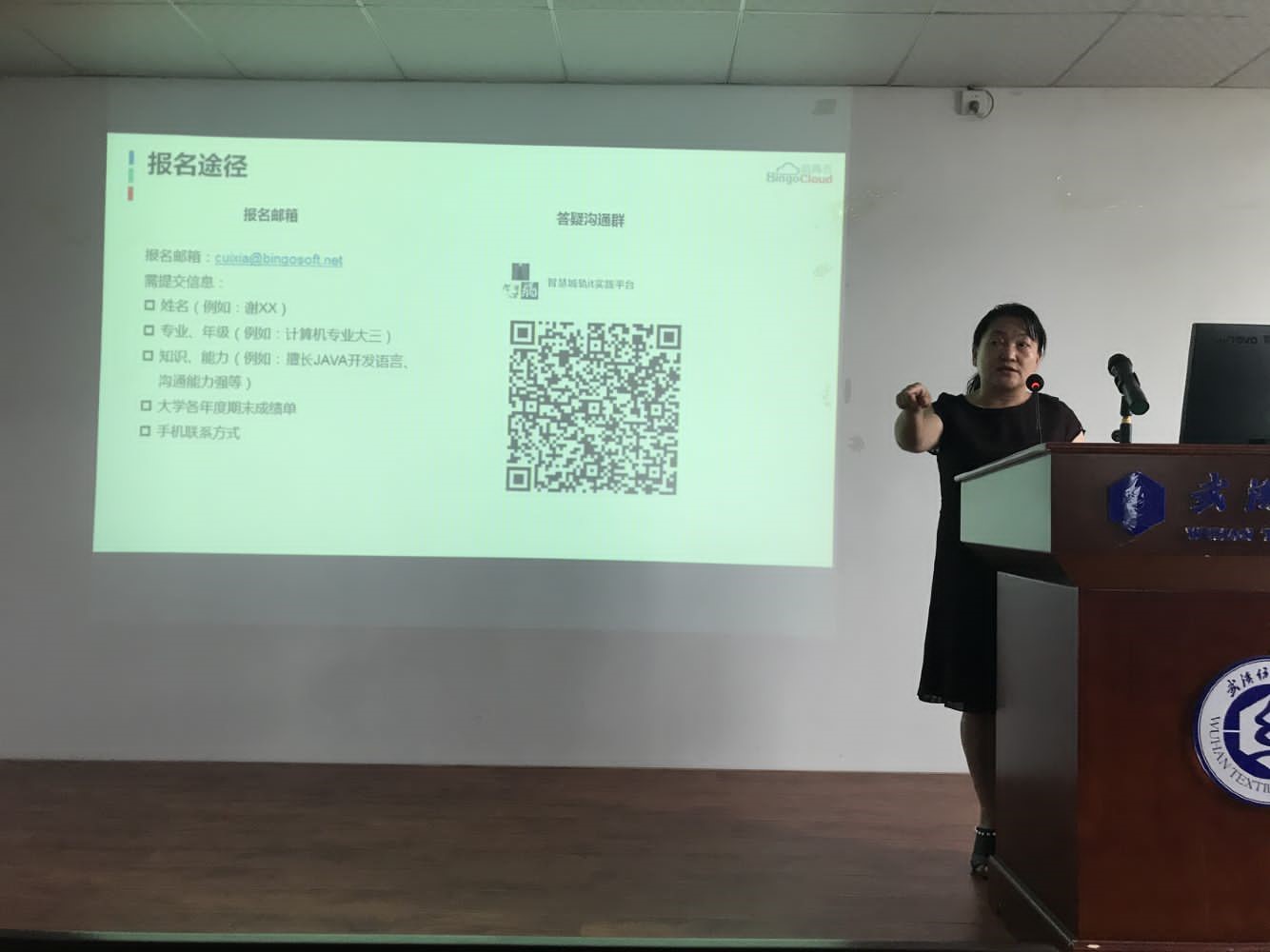 会上,2001级员工,广州品高软件技术有限公司高管洪枝全委托业务部经理谢文迪对公司和行业进行了回顾,向同学们介绍了公司的发展历程,并展示了公司所取得的创新成果以及公司目前的发展攻略和服务对象。随后主讲人对行业技术发展趋势进行了详细分析:新的数字时代要求应用支撑变得更快,传统技术平台难以支撑前台快速创新。并从此方面详细介绍了传统的业务与应用架构面对快速创新的应对策略,着重介绍了低代码开发平台的建设过程、工程实践过程与应用实例。最后主讲人对该IT实践平台进行了介绍。从员工角度分析了对实践平台的要求,随后对平台的设想和参与安排进行了介绍。