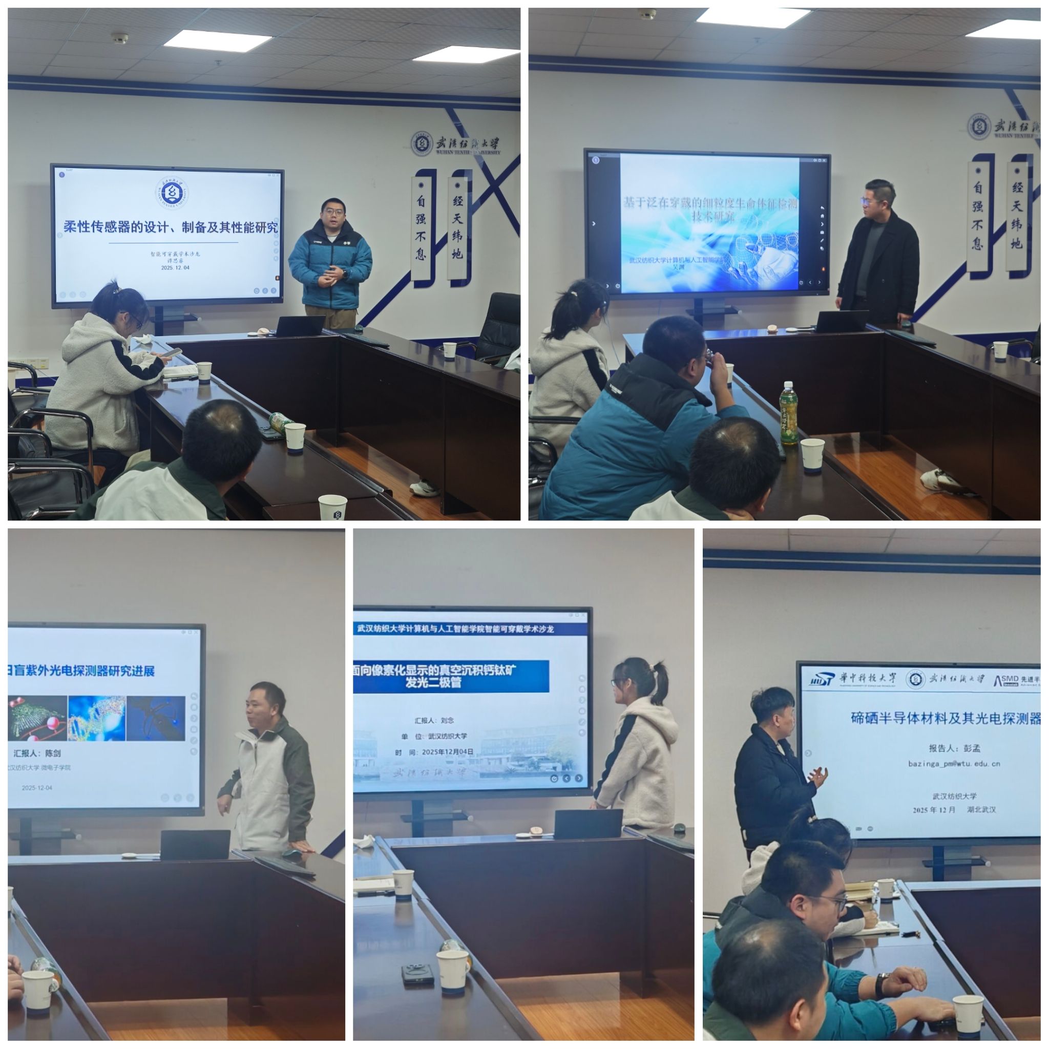 在会议中,五位老师围绕智能可穿戴技术及相关领域作了精彩报告。纺织公司谭思睿作题为“柔性压力传感器的设计、制备及其性能研究”的报告;微电子公司刘念、彭孟、陈建分别就钙钛矿发光二极管、碲硒半导体材料光电探测器、日盲紫外光电探测器等方向分享最新研究成果;365英国上市吴渊作“基于泛在穿戴的细粒度生命体征检测技术研究”报告,系统阐述了可穿戴设备在健康监测领域的应用前景。