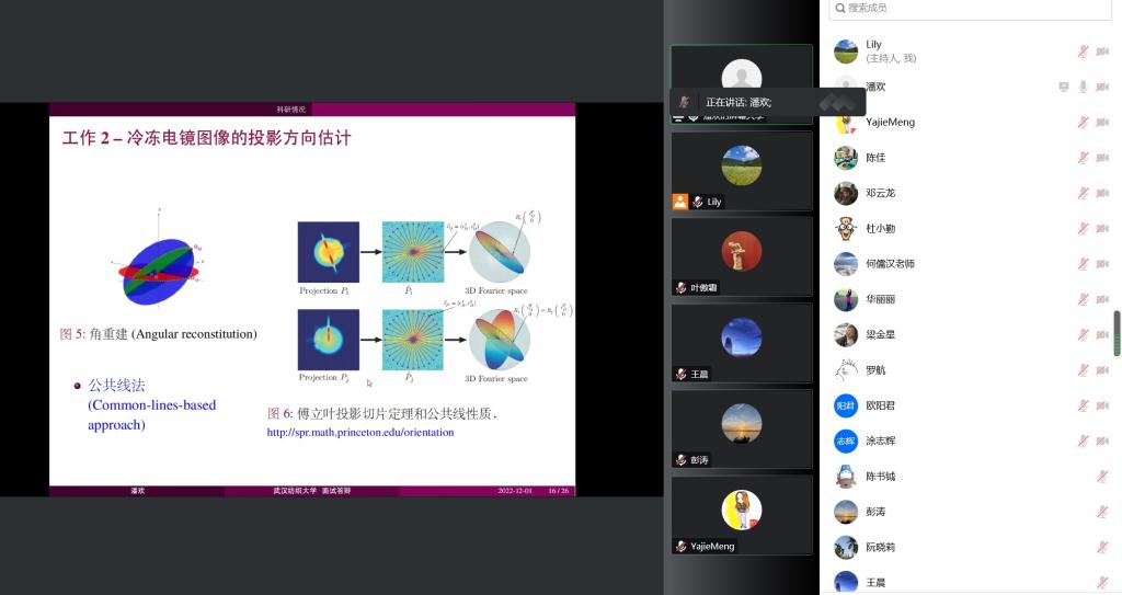 深圳大学潘欢博士后为在线老师作题为“冷冻电镜图像的投影方向估计与三维重构算法”的学术报告。她介绍到,冷冻电镜单颗粒重构技术是确定⽣物⼤分⼦结构的⼴泛使⽤⽅法,然而受限的使用剂量、获取图像的低对比度、投影⽅向的未知等因素,为该技术带来了诸多挑战。她的研究重在探索冷冻电镜单颗粒重构中的三维重构精准数学模型,建立相应的变分框架,设计出快速高效数值计算方法求解三维重构和投影方向估计问题,建立算法的收敛性理论。通过对冷冻电镜单颗粒重构问题的研究,促进新的数学分析工具和数值计算方法的产生。