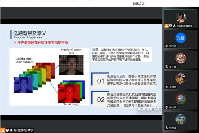 左传的报告题目是“Camera response prediction method based on digital imaging theory”,他提到,在多光谱重建领域,彩色数码相机的作用逐渐被人们所重视。越来越多的研究人员试图将数码相机应用到光谱测量中,并取得了一定的进展。基于数码相机的光谱测量对于光源的估计使得光谱重建只能在某一单一光源下保持精度,而对于开放的光照环境下,光源多变且光照不均、对象距离远近多变、对象类别多样化等诸多因素导致光谱重建精度不高。为解决这一问题,需寻找成像条件与成像系统响应值之间的物理关系及模型。基于此,预测代表性光谱数据集响应值,综合光谱数据集及其预测响应值构建成像系统光谱重建模型,理论上可以突破复杂因素制约重建高精度多光谱图像的影响。