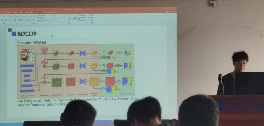 李攀的报告题目是“LTMVSNet: A Lightweight Multi-view Stereo network with Transformer”。他指出:基于学习的多视图立体方法将源图像单应性变换到参考图像中形成三维体,并将其融合为代价体,由后续网络进行正则化。融合步骤在连接二维语义和三维空间关联方面起着至关重要的作用。然而,以前的方法利用额外的网络来学习二维信息作为融合线索,没有充分利用三维空间相关性,带来额外的计算成本。因此,他提出了LTMVS,利用所提出的聚合Transformer来有效地学习2D语义和3D空间关联,能够实现能好的效果。
