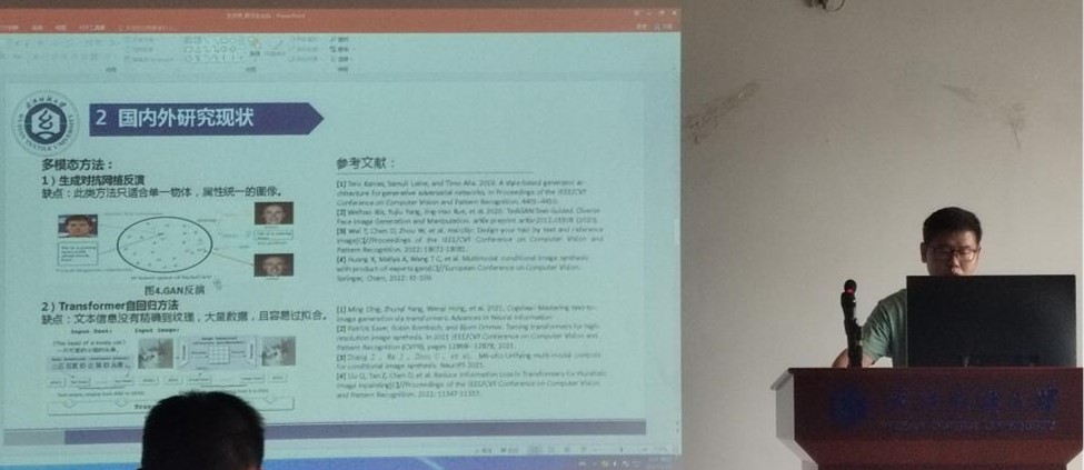 文炎芳的报告题目是“基于多模态信息的服装草图到图像生成方法研究”。他指出,大多数方法只包含单一的条件信息,不能根据草图笔画生成服装的褶皱,面临着低保真度的问题。于是他提出一个两阶段的多模态框架,将文本和草图作为条件信息共同指导生成服装图像。该方法通过改进现有的向量量化编码方法,可以重建服装图像的细节和褶皱,在单模态和多模态任务中都能生成高保真度的服装图像。