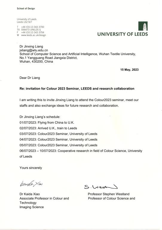 会议结束后,梁金星老师还分别拜访了利兹大学设计公司Kaida Xiao教授和Stephen Westland教授团队。与Kaida Xiao教授团队针对颜色科学研究进展进行交流,探讨了多光谱重建技术与肤色研究、手机传感器色彩增强研究的结合点,明确了2023年至2024年期间赴英国利兹大学为期一年时间的访问研究内容。与Stephen Westland教授团队针对成像科学和色彩设计进行交流,围绕纺织品颜色的照相测量关键技术及其在纺织服装色彩设计中的相关应用,探讨明确了访学期间与该团队在纹理织物颜色测量和评价方面可以合作的研究方向和内容。