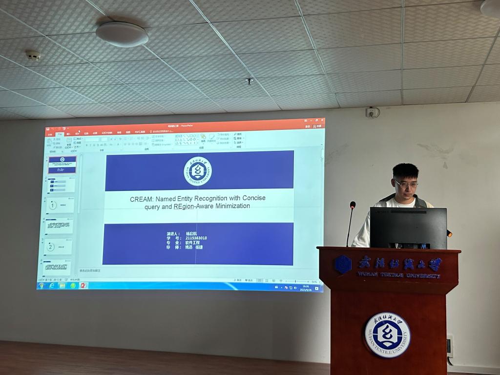 杨启航同学分享的主题是“CREAM: Named Entity Recognition with Concise query and REgion-Aware Minimization”,他基于命名实体识别(NER)领域的兴趣,为了缓解高计算成本,对实体内容信息的有限考虑,以及产生明显边界的倾向等基于mrc的模型所面临的问题,引入了CREAM,一种利用简明查询和区域感知最小化的增强模型。基于实体类别生成简洁的查询,通过有效的连续交叉熵损失来识别整个实体。进一步提供了深入的分析来揭示它们的好处。该方法在六个著名的NER基准上进行了评估。实验结果证明了它的显著有效性,超越了目前最先进的模型。