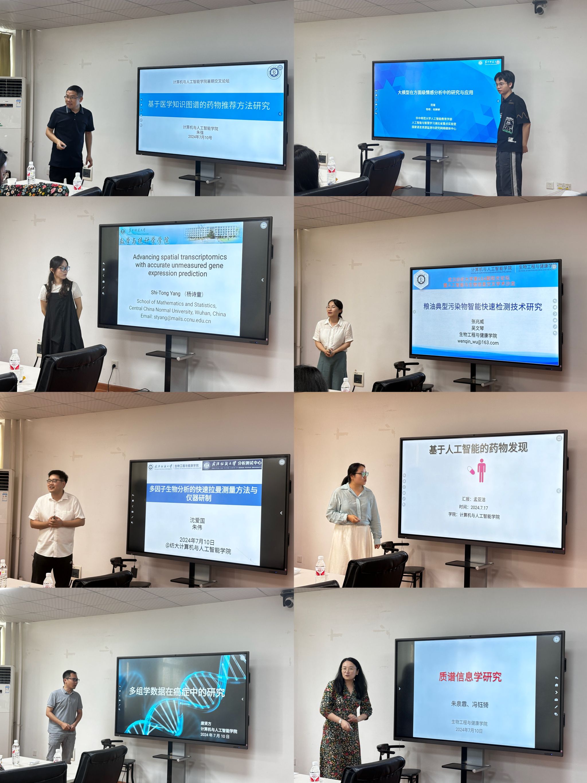 围绕人工智能与生物信息等内容,来自华中师范大学、公司生物工程与健康公司及365英国上市的八位博士依次作了详尽而深入的研究成果报告,内容涵盖了医学知识图谱、基因表达预测、多层次组学数据分析等多个方向。冯钰琦教授对博士们的报告给予了细致的指导。