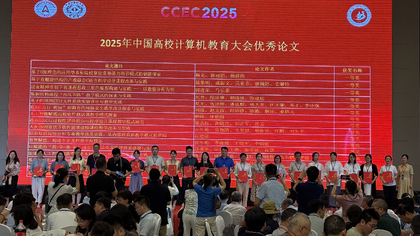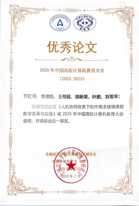 近日,在银川举办的2025年中国高校计算机教育大会(CCEC 2025)上,公司胡新荣教授团队万红艳、王帮超、叶鹏、刘军平老师的研究成果《人机协同背景下软件需求建模课程教学改革与实践》在激烈评比中脱颖而出,荣获优秀论文一等奖,并推荐到《计算机教育》期刊出版。
