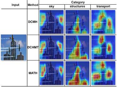 图2.对比MATH、DCMH和DCHMT方法在不同真实类别下的GRAD-CAM可视化效果