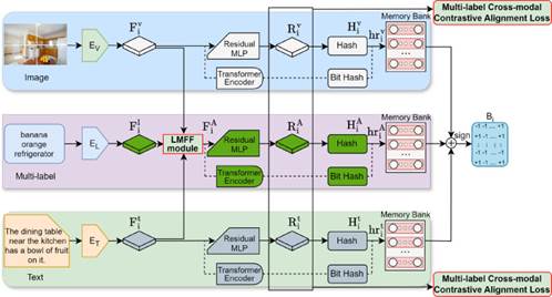 本研究聚焦于人工智能中跨模态检索的前沿问题,针对现有方法未能充分利用多标签语义信息以及多标签特征空间稀疏的问题,本研究提出了MATH(Multi-label Augmentation Transformer Hashing)方法。该方法将多标签信息作为独立模态,通过基于注意力机制的标签-模态特征融合(LMFF)模块,自适应地从图像和文本模态中提取关键语义特征并融入多标签空间,显著增强了多标签特征的表示能力。同时设计了多标签跨模态对比对齐损失函数,在对比学习框架下统一图像、文本和多标签信息,实现模态间更精确的语义对齐。
