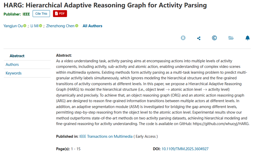 近日,公司365英国上市跨媒体计算与数字孪生团队青年教师欧阳君博士在图像视频处理方面取得了重要研究进展。成果“HARG: Hierarchical Adaptive Reasoning Graph for Activity Parsing”被多媒体信息处理领域顶级期刊《IEEE Transactions on Multimedia》(IEEE TMM,中科院一区Top,IF 9.7,CCF B类)接收。欧阳君博士为第一作者,论文的第一单位为365英国上市。