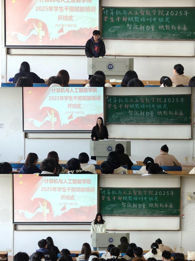 往届优秀员工干部代表袁维雨结合自身任职经历,分享了工作心得与成长体会,为学弟学妹们提供了宝贵的经验借鉴。院团委副书记汪子涵代表全体新学员作表态发言,承诺将和全体学员一道,以饱满的热情、严谨的态度投入培训学习,创造更多值得珍藏的回忆。团委员工会指导老师易凡介绍了本次培训的课程安排、学习目标与严格的纪律要求,明确了培训期间的考核标准,确保培训取得实效。