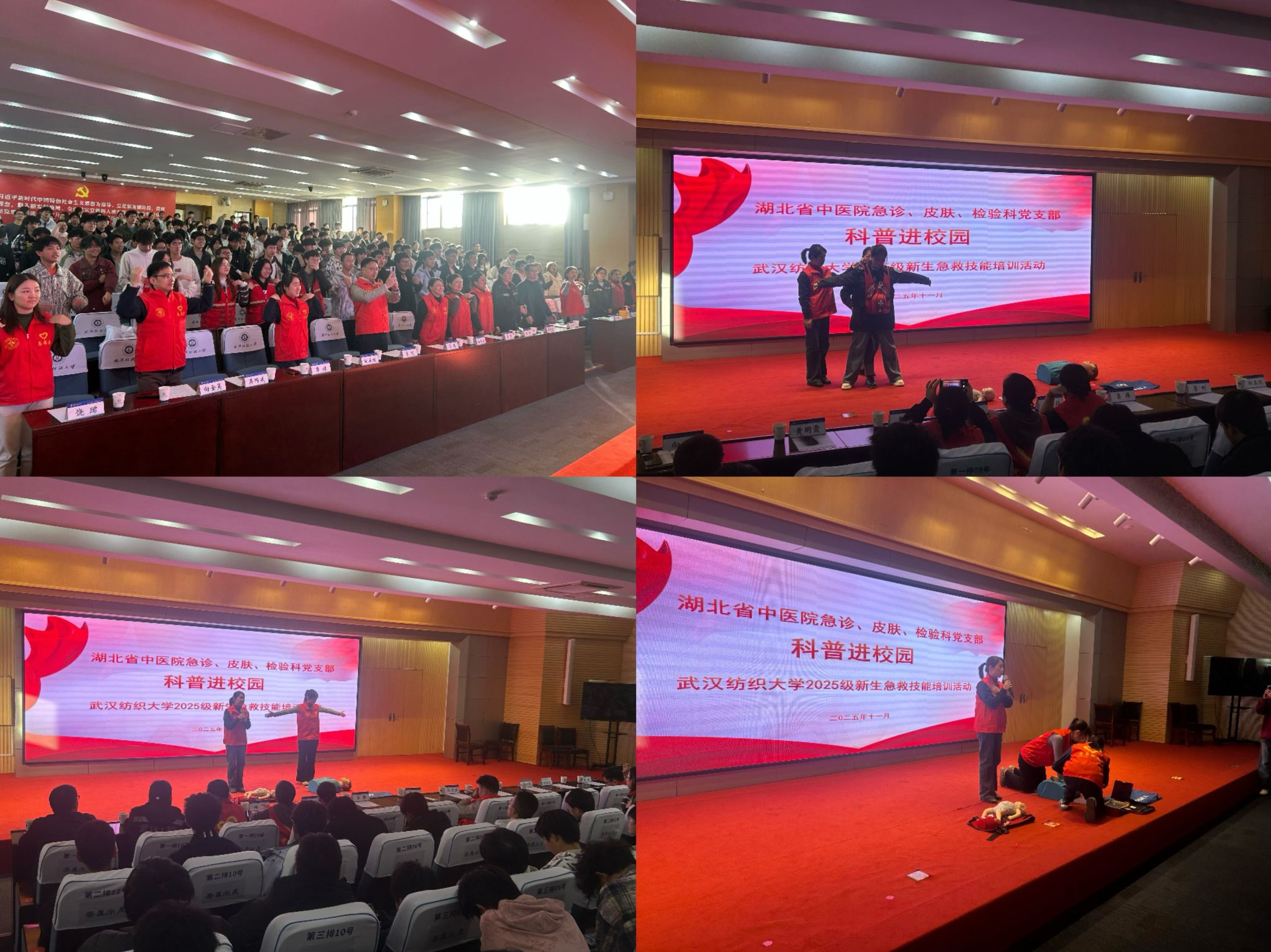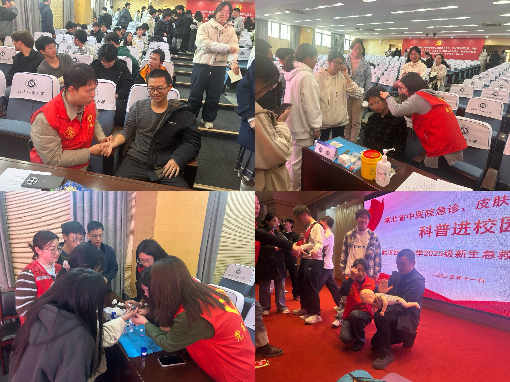 随后,湖北省中医院专家团队带来了一场内容丰富、干货满满的宣讲与培训:急诊党支部李刚主任细致解析急性心梗的识别要点与急救流程,让师生清晰掌握突发心脏疾病的科学应对方法;皮肤科党支部白书仙医生深入浅出讲解常见皮肤病的识别技巧与认知误区,助力大家科学区分皮肤问题、规避错误护理方式;护理专家吴雨曦借助办公操教学视频,带领现场师生起立跟随演示,并逐一讲解每个动作的发力要点与舒缓功效,让大家在实操中掌握缓解疲劳的实用方法;肖洁、黄明霞、张培、颜双双等急救专家详细讲解海姆立克急救技术、心肺复苏(CPR)及自动体外除颤器(AED)的使用要点,结合动作演示让核心操作流程更加通俗易懂;检验科技师饶珺同步提供现场血糖检测服务,为师生即时掌握自身健康状态提供贴心参考。
