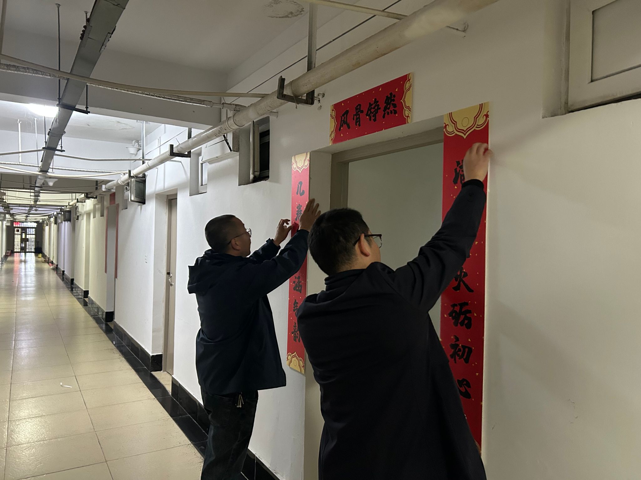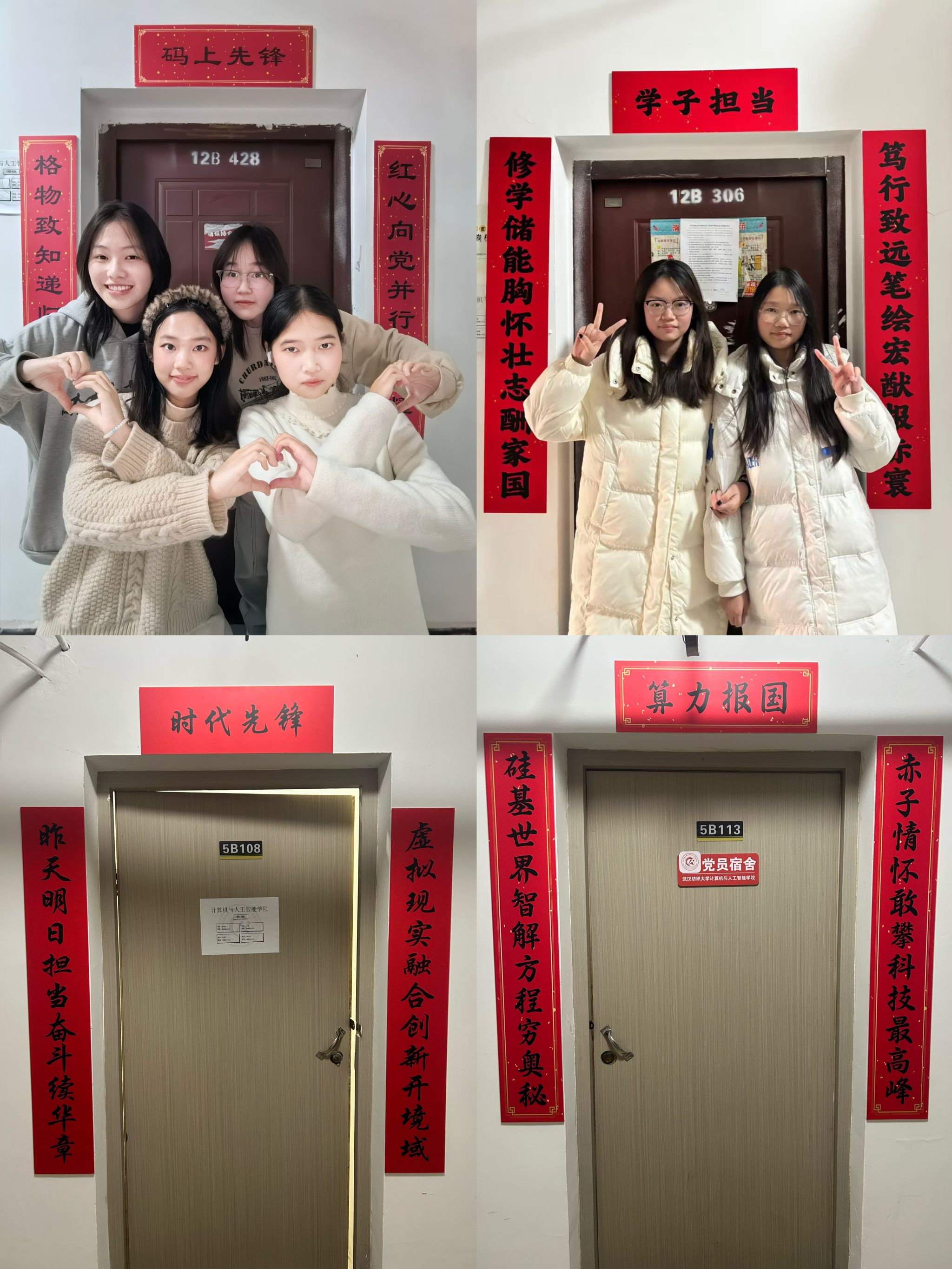 活动自启动以来,得到了公司各寝室同学的积极响应和热情参与。同学们以寝室为单位,围绕“红韵”主题,巧妙构思,将红色元素、励志名言与传统楹联相结合,充分发挥创意,精心装点“小家”。公司党委书记晏伟、副书记向涛,在活动中亲自为寝室张贴对联,对同学们表达新春的祝福!