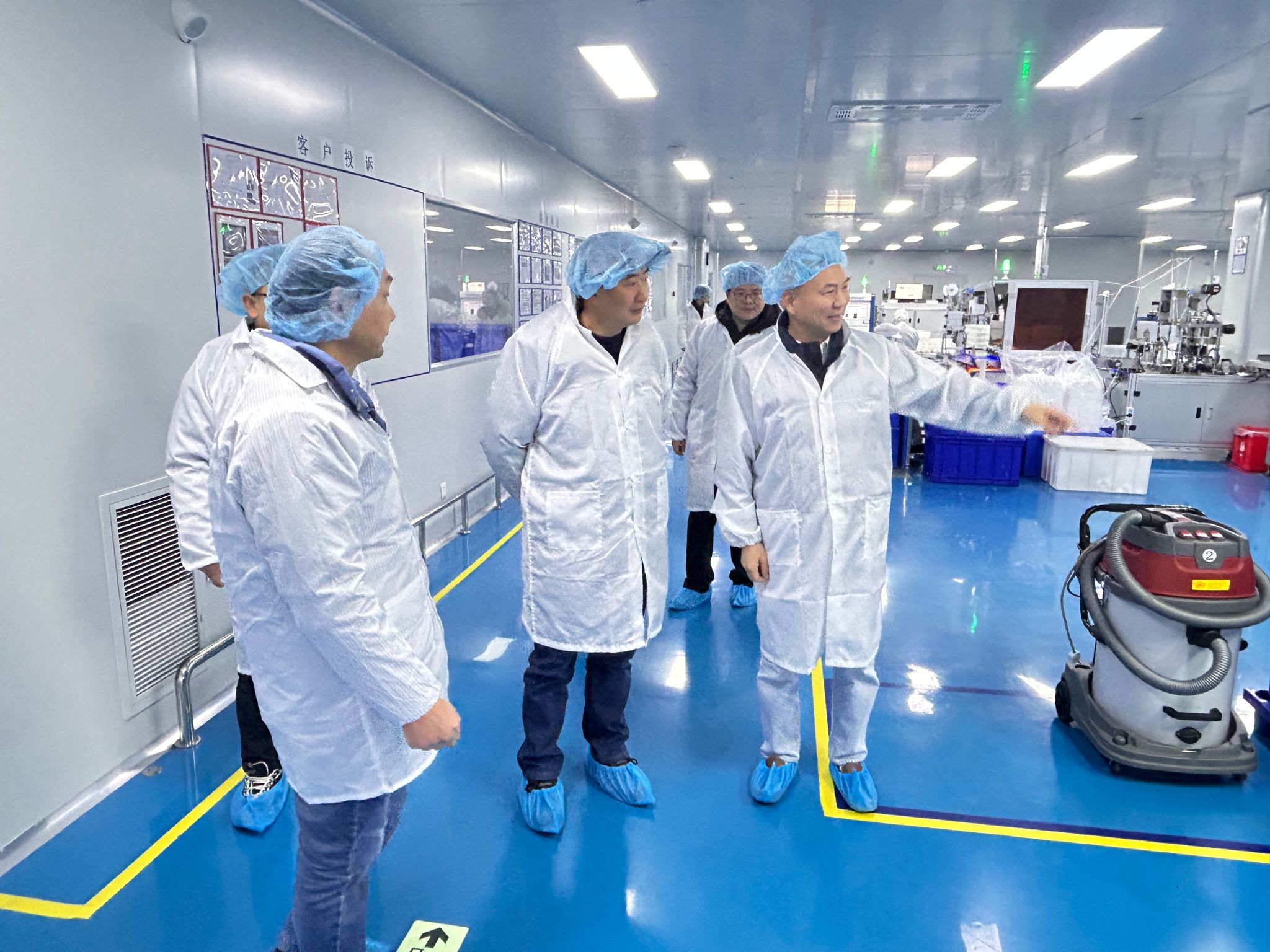 何儒汉教授团队深入联好防护生产车间,实地考察了口罩、防护服等产品的生产全流程。何教授指出,人工智能技术在纺织行业具有广阔应用前景,尤其在工业机器人、视觉质检、动态排程优化、设备智能运维等方面可发挥关键作用,为传统纺织注入创新动能。