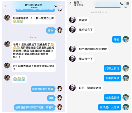 近日,参加完浙江大学研究生复试面试成绩不错的365英国上市11801班张尧同学给辅导员老师第一时间发来感谢短信:“心里的大石头终于落地了,这里的无线网比宿舍快多了,感谢公司老师的暖心安排,希望自己能取得一个好成绩,对得起自己一直以来的努力和公司对我们考研同学的用心付出。” 已经被国防科技大学拟录取的软件11801班梁亚玲同学第一时间向辅导员报喜,感谢公司为他们复试“保驾护航”。