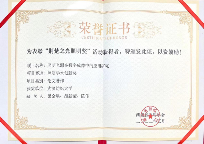 为了调动广大照明科技工作者和企事业单位的积极性、创造性,促进湖北省照明事业的发展,根据《中华人民共和国科学技术进步法》和《国家科学技术奖励条例》的有关规定,湖北省照明学会从2021年起正式设立“荆楚之光”照明奖。该奖项旨在奖励省内外照明领域中,在科学研究、技术创新、成果推广应用、实现高新技术产业化、照明工程实施和科普教育方面做出杰出贡献的企事业单位和个人以及照明项目、照明产品。奖项设置照明科技创新奖、照明工程奖、照明设计奖、照明学术创新奖等四项内容。公司青年教师梁金星、胡新荣教授和陈佳副教授的共同研究成果荣获“照明学术创新奖”。
