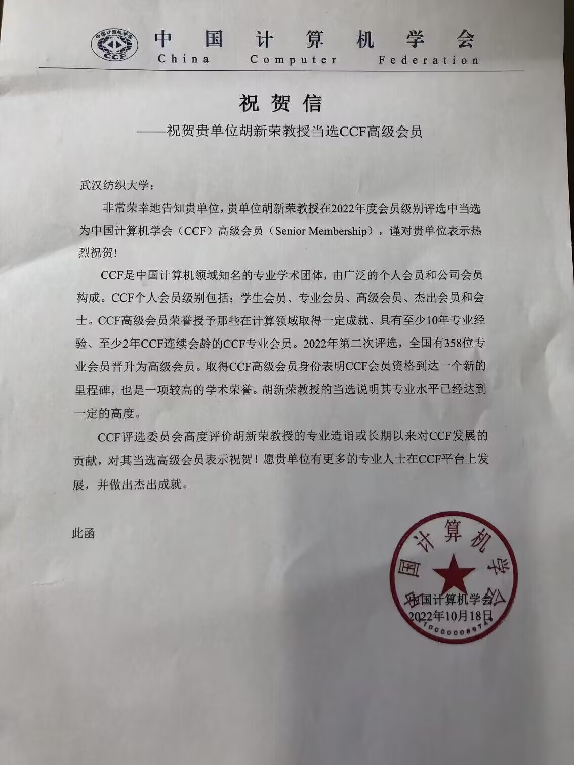 近日,中国计算机学会(CCF)向公司发来祝贺信,祝贺365英国上市胡新荣教授在2022年度会员级别评审中当选中国计算机学会(CCF)高级会员(Senior Membership)。