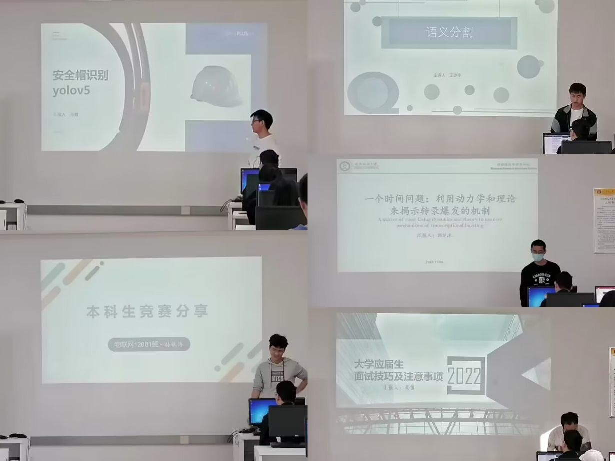 活动中,计算机系五位同学依次进行了分享。计算机12002班冯傲同学分享了基于解决施工场地人为监管安全帽佩戴情况难度高、易出纰漏问题的自主设计项目——安全帽检测,并分享了自己的开发流程及目前项目的不足。计算机12001班郭延冰同学介绍了利用动力学理论来揭示转录爆发机制的研究背景及其意义,并由转录爆发与潜在分子过程之间的脱节这一问题引出了内容的重点,即两态模型、协作绑定和速率限制模型。物联网12001班孙银涛同学分享了自己称之“不完美的”竞赛经验,建议同学们要通过专业优势和本身兴趣选择竞赛,要不惧失败、敢于尝试,更多的关注对于做项目过程中的所获而非结果,可以通过选择团队项目来弥补自身短板。计算机12002班王步宇同学分享了一个国内有关语义分割的框架,指明此项目与视频处理项目不同,它更侧重于图片的处理,试图借此项目制作出精美图片。物联网11902班姜恒同学结合自身面试经历分享了大学应届生面试技巧及注意事项,从面试前的准备工作、面试中的注意事项及面试通关技巧三个方面展开讨论