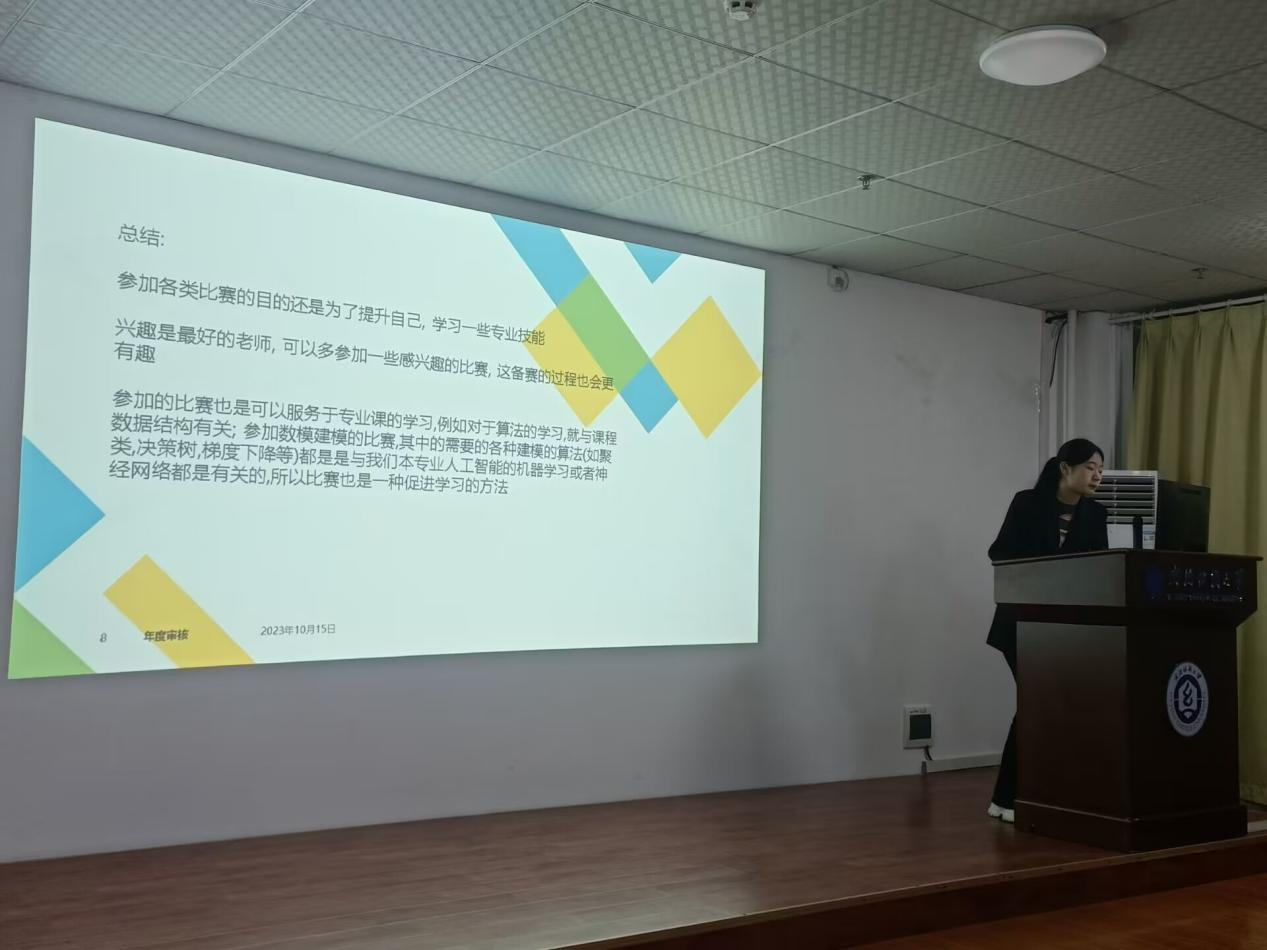 本次活动也同步组织了朋辈分享会,邀请了2021级人工智能专业谢飞和张祉云两位同学做了学习和竞赛分享。谢飞通过分享自己的学习经历,向大家介绍了四个提升编程能力的网站,并重点分析了国际老员工程序设计竞赛(ACM-ICPC)的规则与流程。在分享中,他强调了将编程视为兴趣而非功利的重要性,并结合自身经历提出了一些建议,帮助同学们培养兴趣。张祉云在分享中详细介绍了中国老员工数学建模竞赛,并将“人工智能”和“数学建模”作为两个关键词,为同学们带来了有关这两个领域的专业知识和实践经验。她强调了学习过程中面临困难的普遍性,提醒同学们要直面困难挑战,认真学习创新算法思想,不断充实自己的专业能力。同时也鼓励同学们积极参与各种比赛,通过参加比赛接触各种各样的问题和挑战,激发自己的求知欲望和创新思维,系统地梳理知识体系,增强团队合作能力,并不断提高自己解决问题的能力。