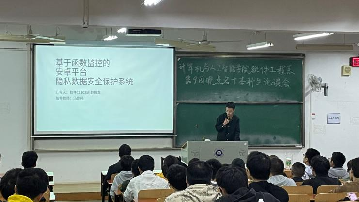软件12102班赵智龙同学带来论坛的第一个报告,题目为“基于函数监控的安卓平台隐私数据安全保护系统”。赵智龙同学首先为大家详细介绍了安卓系统的安全机制以及Xposed框架的强大功能,接着为大家讲解了他是如何通过Xposed框架来完成函数拦截,实现对安卓系统重要敏感数据的安全保护。最后通过两个具体案例为大家详细演示了该设计的实现效果。该设计配合数据脱敏策略能够实现安卓平台敏感数据安全保护等功能。软件12201班范仕洲同学带来的报告题目为“漏洞挖掘”。他首先为大家介绍了漏洞的概念和漏洞挖掘意义。然后讲解了用户使用Web服务获取信息的过程,接着列举了两个常见Web漏洞的案例:失效的身份验证和越权。最后为大家分享了他在学习过程和参加网络安全方向学科竞赛中遇到的问题和积累的经验。