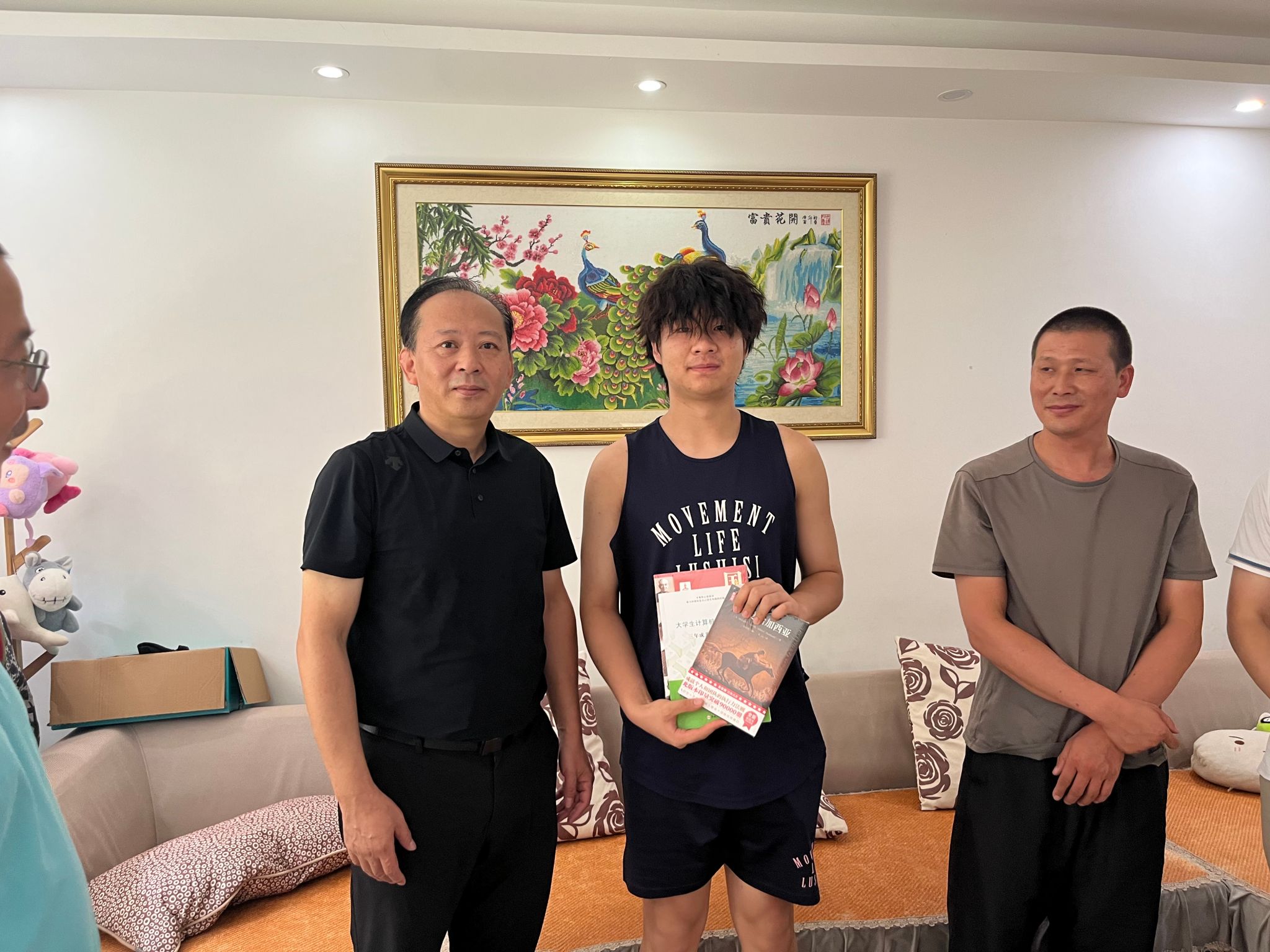冯军注意到茶几下摆放着一叠厚厚的获奖证书,询问了高才念高中时期的获奖经历,对高才念成长道路上付出的努力表示肯定,鼓励他要坚持梦想,脚踏实地,把握住大学四年弥足珍贵的时光。最后,冯军赠予了高才念《国之栋梁》、《计算机专业老员工之路》和《把信送给加西亚》三本书籍,希望他能成为一名博学多才的新时代老员工。