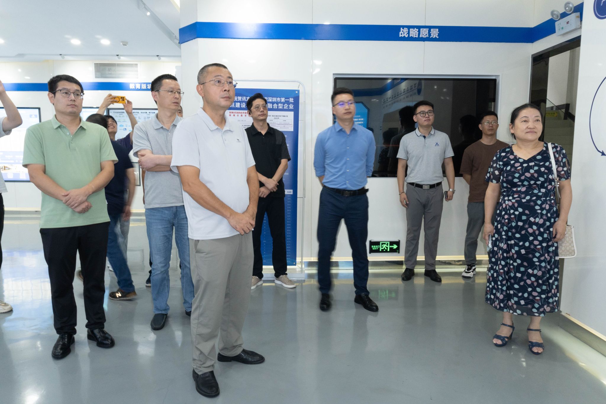 在深圳讯方科技有限公司,调研组首先参观了讯方文化展厅,深入了解了公司的发展历史、公司发展生态链、岗位模型(典型项目工作场景以及岗位需求模型)、(打造”一基地三中心数字人才培养体系”)、产教融合教学成果(介绍F5G全光校园网)、打造“一平台两中心三应用”智慧校园体系、建立工业软件产业公司、介绍专业课程体系和专业实训体系等。在与公司负责人进行座谈时双方重点就员工生产实训,技能提升以及团队培训等方面进行深入的交流并达成初步合作意向。