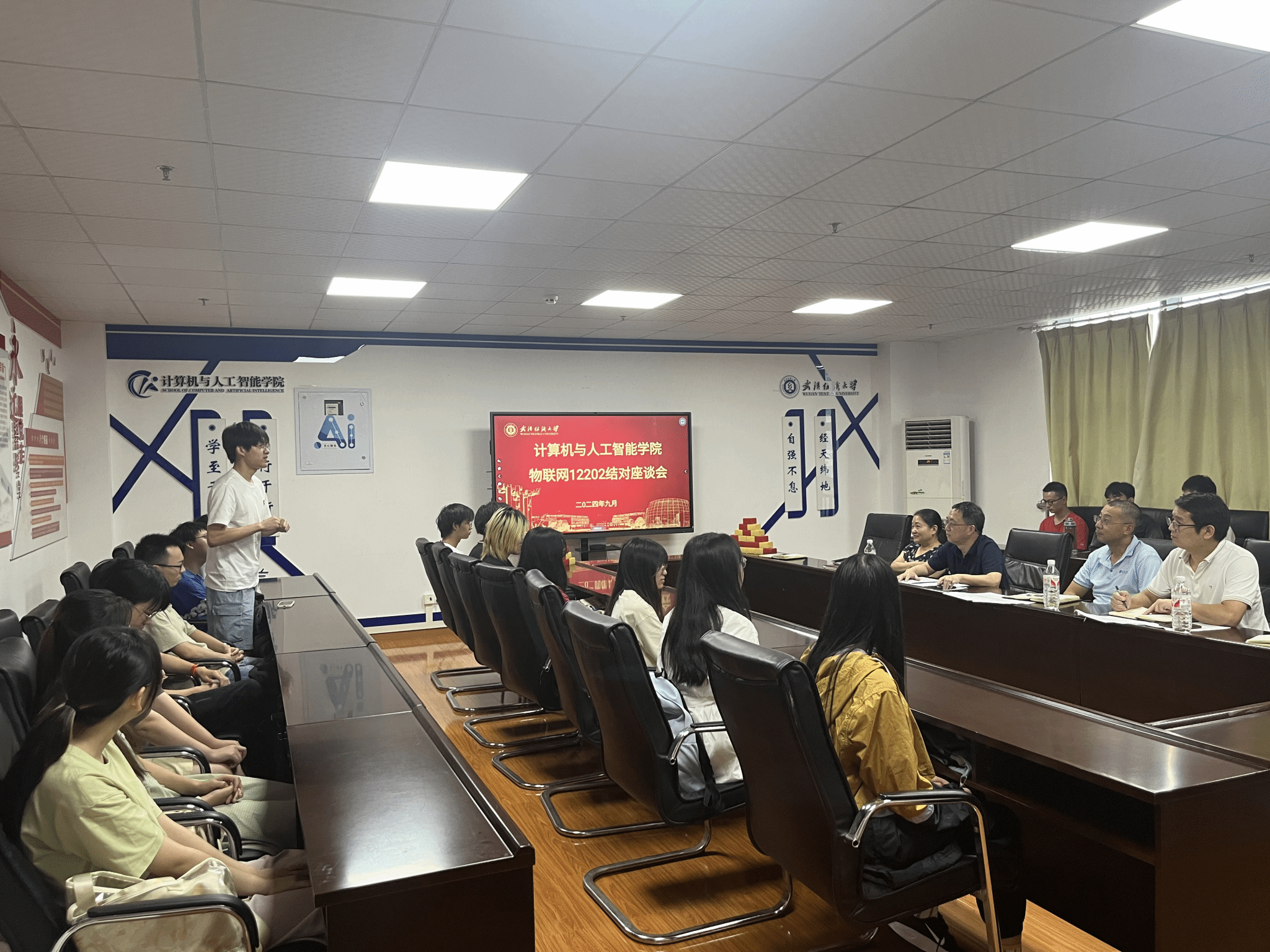 活动中,王济平与结对员工亲切交流,为同学们答疑解惑。王处长在回答员工问题中,肯定了物联网专业的学科优势;指出了参加高质量竞赛和考研是同学们大学四年中提升综合能力的法宝,要在竞赛中提升自我,在考研中实现自我;他寄语全体同学要找到自己的兴趣所在,找到自己的人生方向;学会管时间,做时间的主人;学好专业,乐学好学,做好本职工作。