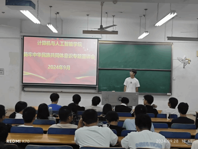 9月28日下午,公司在三栋教学楼举行了铸牢中华民族共同体意识专题宣讲会,24级新生辅导员首先从我国的民族介绍开始,回顾了中华民族的光辉历史,强调我国民族在政治上团结统一,文化上兼容并蓄,经济上相互依存,情感上相互亲近,其中还特别提到了中华民族共同体意识对于国家统一,民族团结和社会和谐的重要性,紧接着,辅导员开始就我们青年该如何践行和培养中华民族共同体意识展开论述,他鼓励我们可以积极参与到民族团结的实践中去,时刻怀有浓郁的民族情感和爱国情感,推动中华民族走向包容性更强,凝聚力更大的命运共同体。